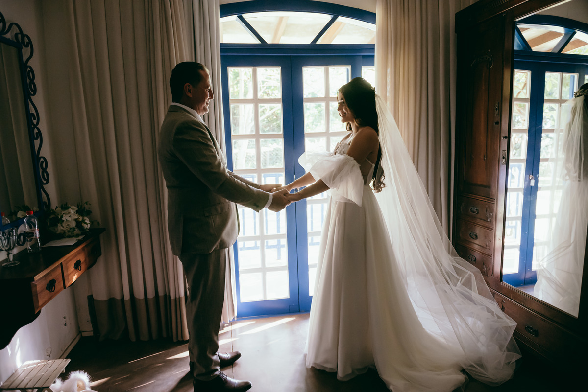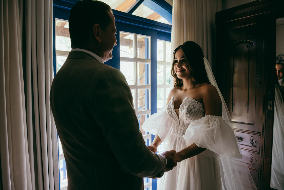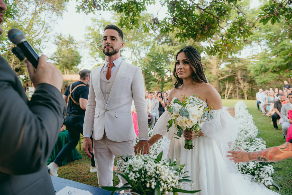 A noiva, simplesmente deslumbrante em um vestido lindíssimo que refletia delicadeza e encanto, caminhava em direção ao altar com um brilho único nos olhos. O noivo, emocionado, a esperava ansioso, e juntos transmitiam a intensidade de um amor verdadeiro.